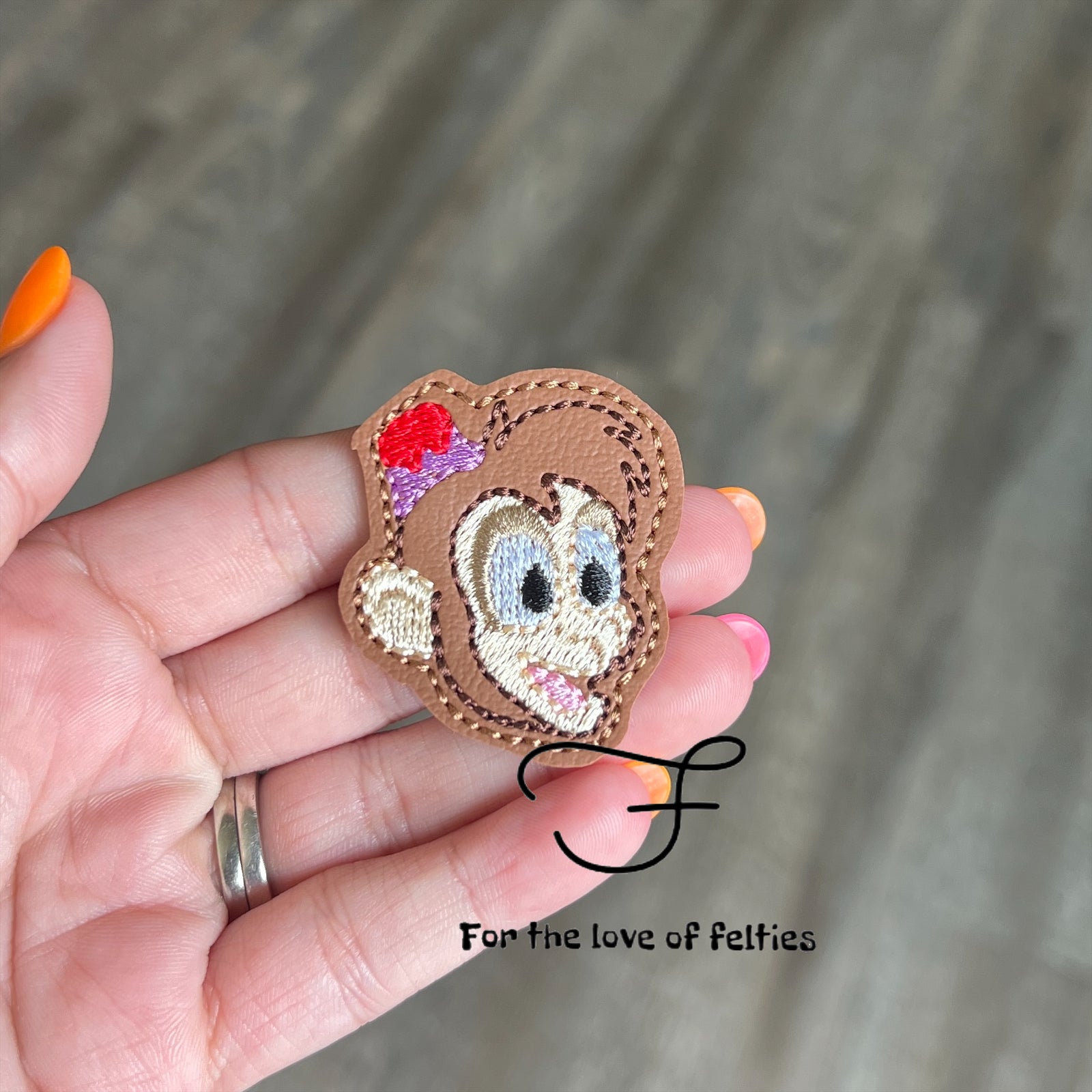 Felties are embroidered on a high quality vinyl and backed with Olyfun. Feltie is approximately 2 inches. Felties can be used to embellish bows, badge reels, clips and scrapbooking.